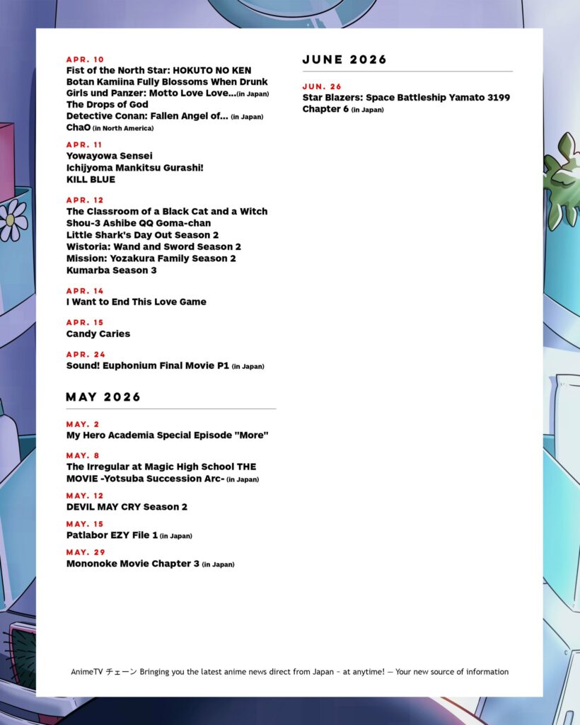 Penggemar bisa menantikan kembalinya seri-seri hits seperti Re:ZERO -Starting Life in Another World-, Dorohedoro, ONE PIECE, Wistoria: Wand and Sword, dan That Time I Got Reincarnated as a Slime. Tak hanya itu, penonton juga bisa menikmati gelombang judul baru yang menarik, termasuk Witch Hat Atelier, Agents of the Four Seasons: Dance of Spring, DAEMONS OF THE SHADOW REALM, dan banyak lagi!